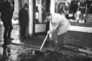 Nico hoeft de beelden niet eens te zien om anno 2024 nog levendig verslag te doen van de watersnood in kapsalon Hollestein. Alsof hij zojuist van de rampspoed is teruggekeerd vertelt hij over de paniek bij Jozef Hollestein die het water in zijn zaak en woonkamer alsmaar ziet stijgen, over zijn verwoede maar zinloze pogingen om de watermassa met een bezem naar de gracht te vegen, over de problemen die al gauw ook bij zijn buren ontstaan. ‘Door de vrieskou was een hoofdleiding in het waternet gesprongen. Het was min tien moet je weten. Dat water veranderde al heel gauw in ijs. Uiteindelijk moest de straat open om de waterstroom te stoppen. Maar toen was het daar al een spiegelgladde glijbaan geworden.’