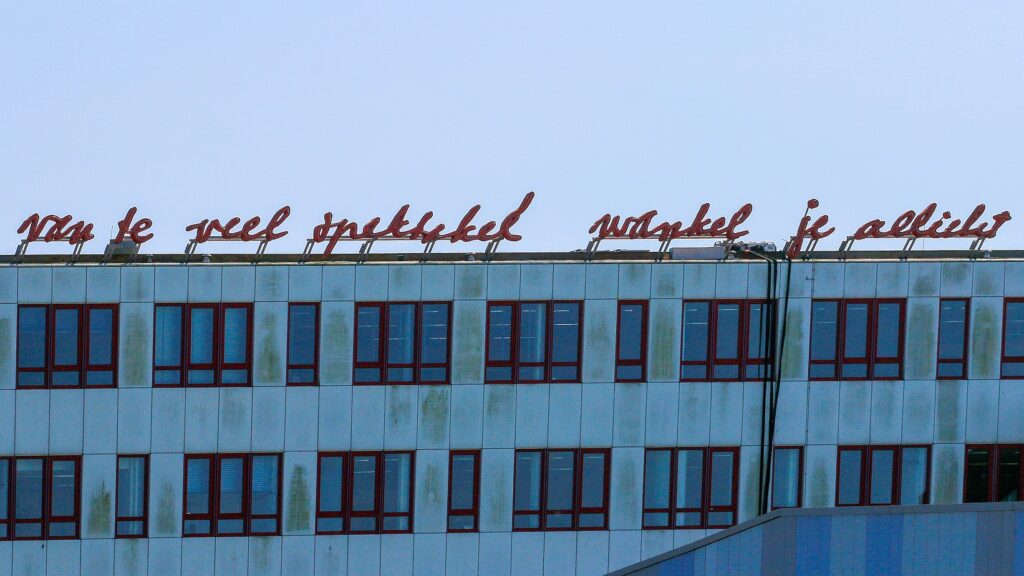 ’Van te veel spektakel wankel je allicht’. Het staat sinds 1994 op het Stadskantoor. De Sociale Dienst trok er een jaar eerder in. Alkmaar achtte toen Lucebert een van de belangrijkste kunstenaars van Nederland. Hij mocht iets bedenken voor op de gevel. Maar hij overleed voortijdig. Zijn nazaten stelden een regel uit zijn laatste dichtbundel voor. Het is een bezwerende formule, zoiets als ‘doe maar gewoon, dan doe je gek genoeg’. Of korter: ‘pas op!’ Op een gebouw van de Sociale Dienst zou je eerder een bemoediging als ‘kop op’, of ‘hou vol’ verwachten. Maar niet dus in Alkmaar. Ik heb het lang geprobeerd, maar uiteindelijk gaf ik het op om te begrijpen wat er nu eigenlijk precies stond. Het klinkt leuk, maar wat bedoelt u, Lucebert? ‘Wankelen’ is ‘bijna vallen’. Maar wat is dan ‘allicht bijna vallen’? ‘Misschien’ bijna vallen? Dan val je dus uiteindelijk niet. Ook niet van ‘spektakel’. En dus ook niet van ‘te veel spektakel’, wat dat dan ook moge zijn. Kortom, quasi intellectueel gebrabbel, zoals veel poëzie van de Vijftigers, waartoe Lucebert zich rekende. Het was vooral een boeiend literair verzet tegen de gevestigde orde in de jaren vijftig. Met Simon Vinkenoog kon je nog lachen. Met Remco Campert kon je je eeuwig jong en onafhankelijk voelen. Maar de andere Vijftigers blonken uit in experimentele onleesbaarheid. Drs. Kipping, ‘neerlandicus’, alias Kees van Kooten, zou er zijn handen vol aan hebben.