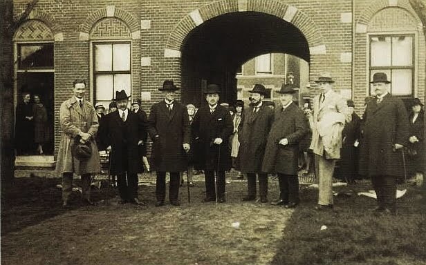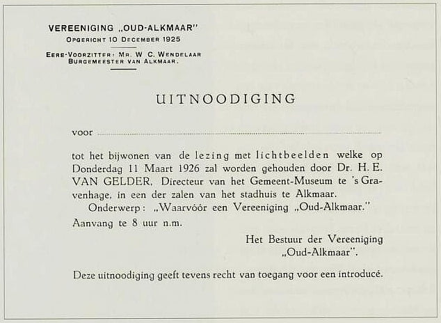 Beeldmateriaal hieronder – v.l.n.r. jhr. Herpert van Foreest, eerste voorzitter – Uitnodiging voor de eerste lezing – Bestuur HVA, Steijnstraat Alkmaar.
